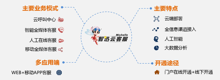 智迅云客服是文思海辉历经多年打磨最终形成的第五代客服系统,也是最新一代的云客服(呼叫中心)解决方案。它采用云端部署共享模式,引入人工智能和大数据技术,通过整合电话、邮件、微信、即时通讯等全信息渠道形成的全流程工单一体化的解决方案,在有效降低企业一次性投资成本的同时,整体提高了客服工作效率和客户满意度。