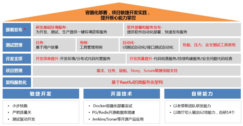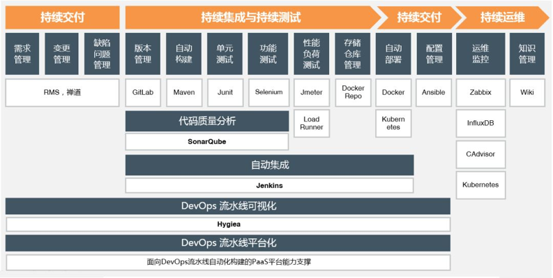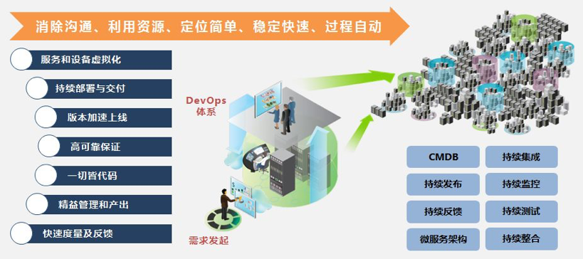 打通市场需求、开发、测试、发布、部署上线、运维等各环节,促进需求、开发、测试、运维团队更紧密地合作,敏捷开发,持续交付、自动运维,提高支撑系统的生产、交付效率。