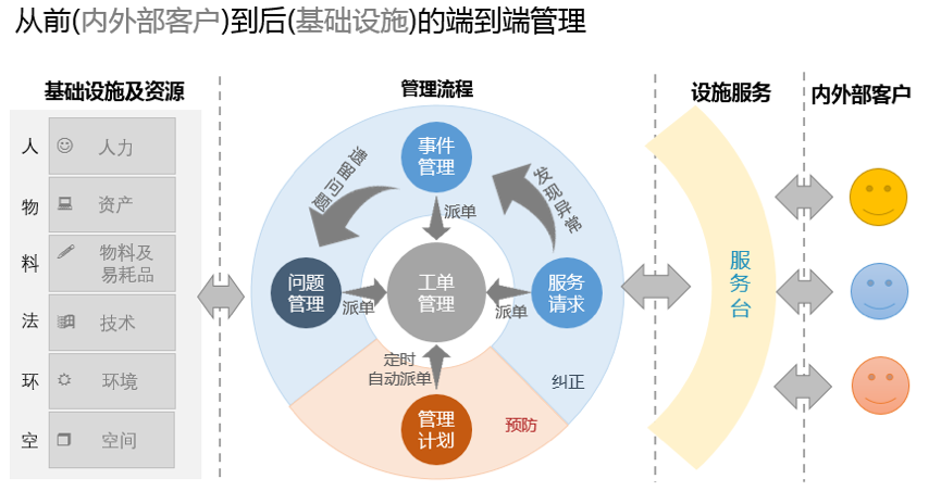 基础设施管理;固定资产管理;易耗品管理;服务订单管理;服务请求管理;管理计划;工单管理;供应商管理;预算管理。