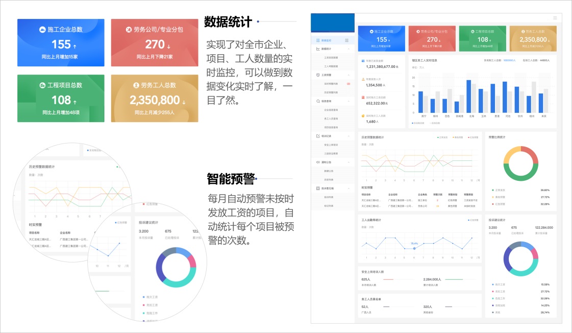 平台系统采用简洁易懂的人性化设计,上手简单;可兼容市场上几乎所有实名制前端设备,无需更换。在开放接口方面,该平台可接入市面上所有银行,能实时查看企业、项目、务工人员信息,对务工人员工资发放数据进行智能化监管预警,形成全市劳务人员市场化调配管理,并能保证系统的安全性和稳定性。