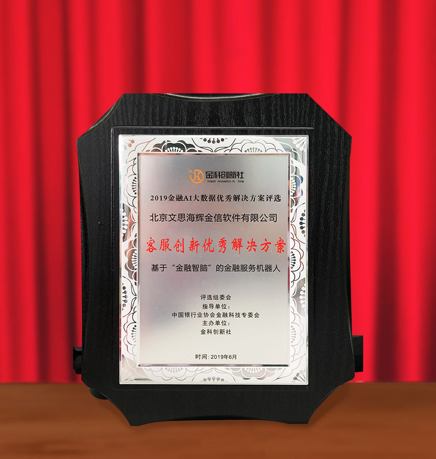 近日,由中国银行业协会金融科技专委会指导、北京软件和信息服务业协会联合金科创新社共同举办的“金融AI大数据优秀解决方案评选”揭晓,文思海辉·金融基于“金融智脑”的金融服务机器人荣获“2019金融AI大数据客服创新优秀解决方案”大奖。