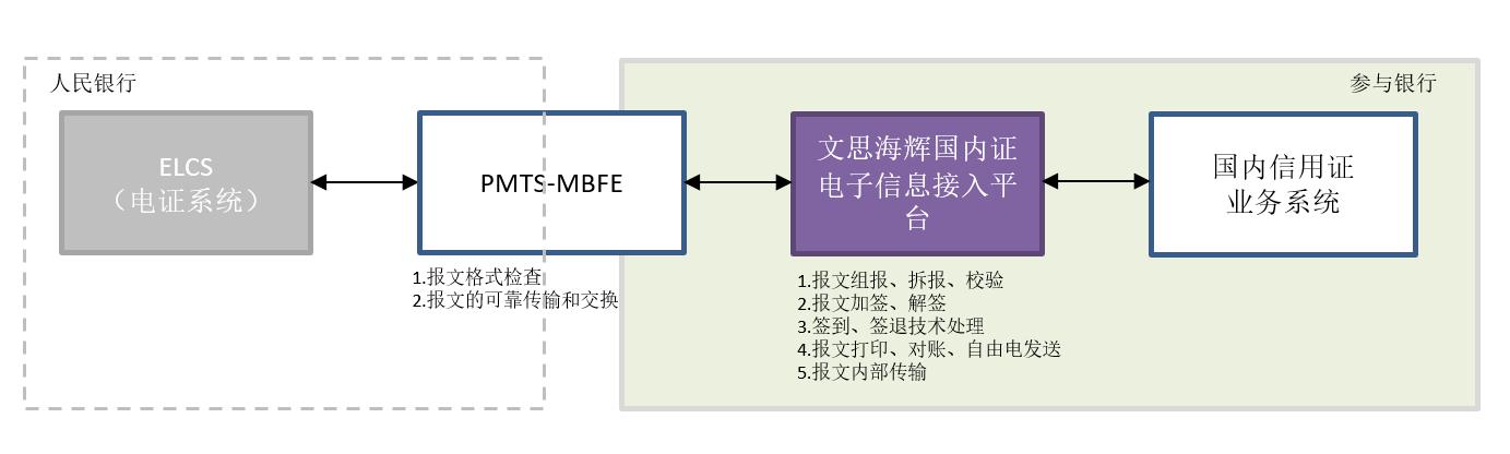 文思海辉·金融电证系统接入解决方紧密结合银行客户的需求,通过信用证的网络化运作,帮助银行梳理简洁的业务流程和便捷的操作手续,将电子商务、网上银行和信用证业务有机结合,为企业实现网上业务提供快捷通道。其中,文思海辉·金融国内证电子信息接入平台将提供电证系统报文组报、拆报及报文校验工作,完成报文的加签、解签等数据安全管理工作,并涵盖签到、签退等技术处理功能,提供报文打印、对账、自由电发送及报文内部传输处理。还将在产品实施方案中提供完整的国内信用证业务系统交易改造处理方案。