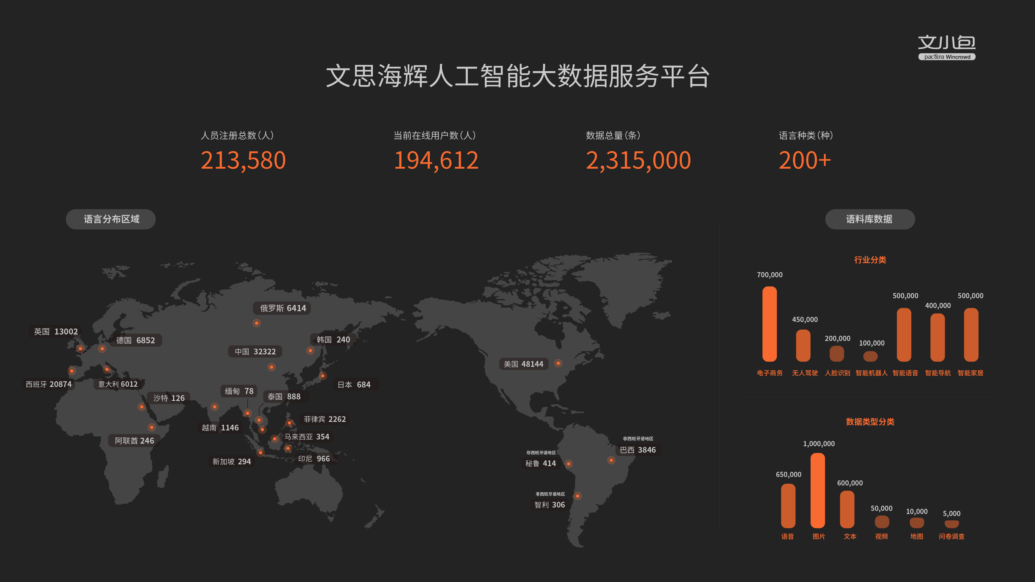 文小包是一个保障高质量、高速交付和高性价比的“三高”人工智能大数据服务平台,主要提供数据采集、数据标注、数据调查三大类数据服务,覆盖图片、语音、文本、视频等各类型数据,拥有严格的项目管理团队和质检管理体系,更具有资源全球化的优势。当前,文小包客户覆盖高科技、零售电商、汽车金融等多个行业,具有200000+全球活跃资源储备。