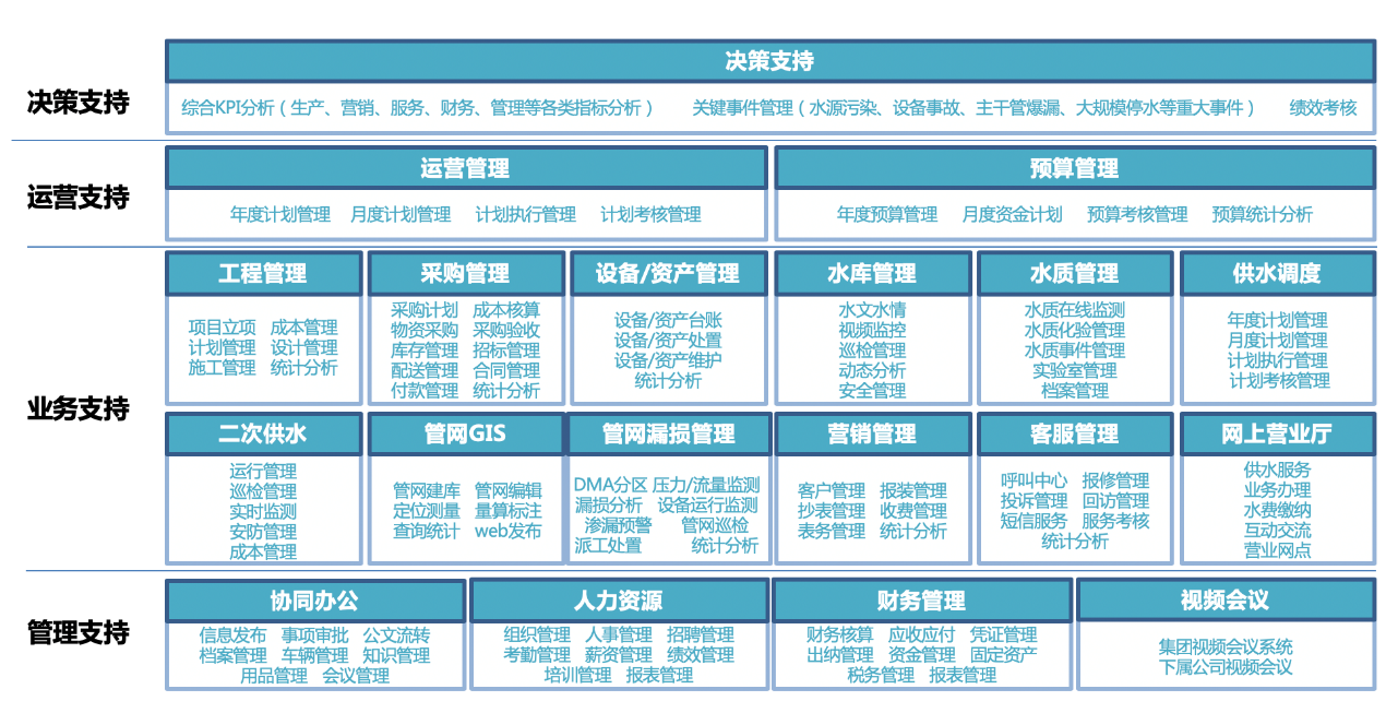 - 业务支持:管理系统含导航图、设备管理、报表管理、水质管理、成本与指标统计分析、报警管理、现场场景虚拟现实、安全管理、远程监控、化验室管理、绩效管理、风险评估、运行最优方案、知识共享中心、移动客户端等;管网系统含导航图、自来水管网GIS系统、自来水SCADA系统、自来水DMA分区计量系统、自来水管网运维系统、自来水管网分析、自来水营收系统、报警管理、移动客户端等。